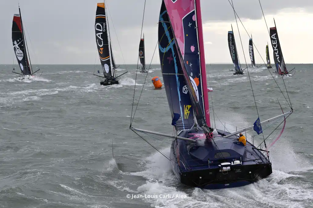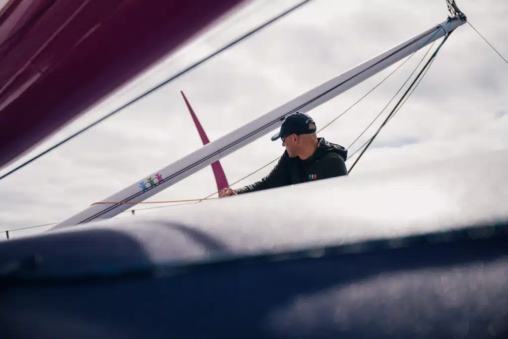 Dans les regards, une même émotion : celle d’un projet qui va bien au-delà du sport, un projet humain avant tout. Avant de prendre le large, l’équipage a marqué un passage symbolique devant le quai des Abeilles du Havre. Puis, derniers au revoir à l’équipe technique : la grand-voile est hissée et le silence se fait à bord. Nos deux navigateurs se retrouvent alors seuls, prêts à vivre cette phase d’avant-départ si particulière, entre concentration et excitation.